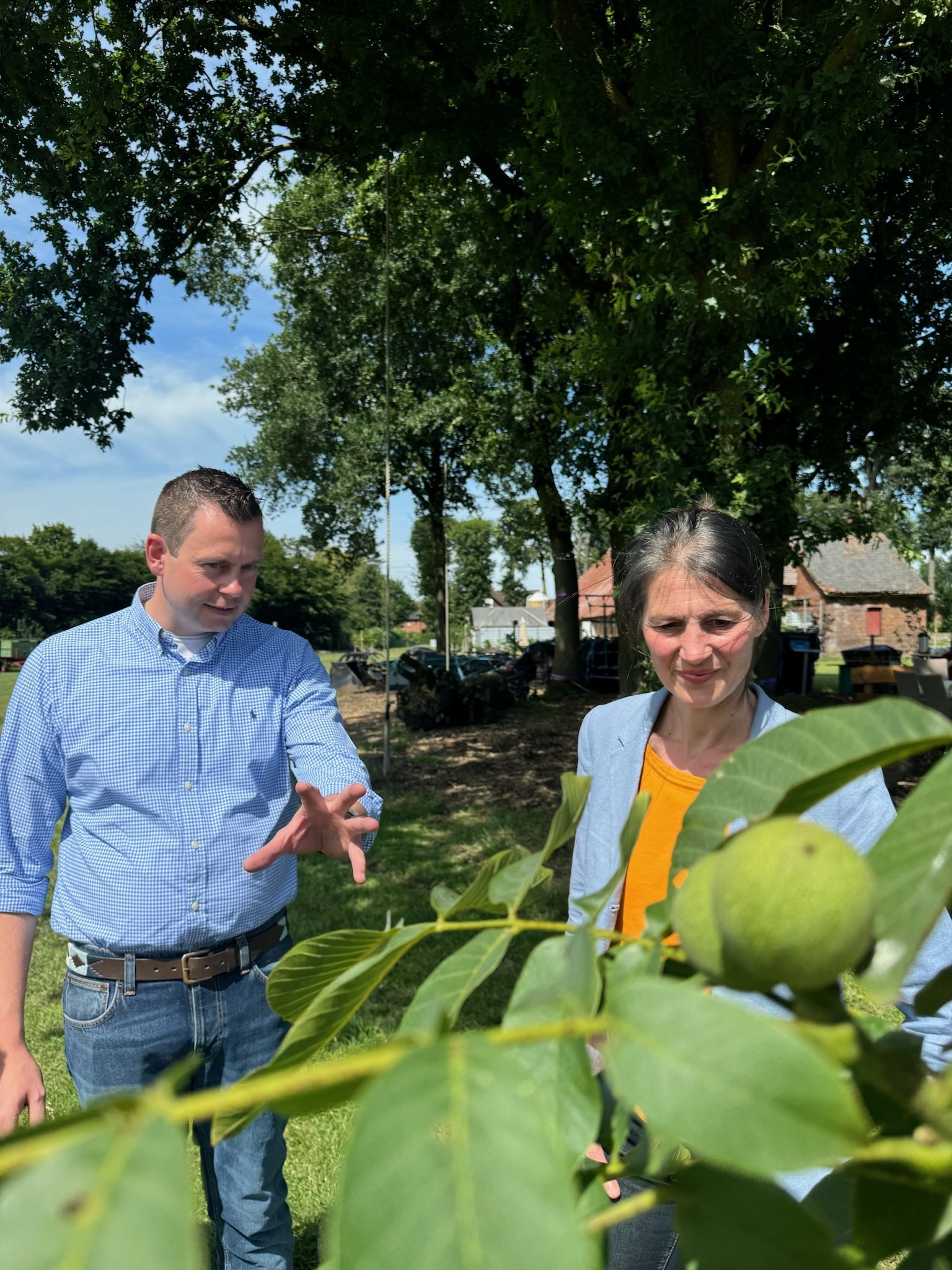 Der Abschluss der Sommerreise fand auf dem Hof Schiebe in Neuenkirchen-Vörden statt. Insgesamt 650 Walnussbäume wurden auf 4,5 Hektar angepflanzt, außerdem hält der Betrieb rund 1.400 Freilandhühner. Die Vermarktung der Eier setzt der Hof Schiebe über Automatensysteme an Verbraucherinnen und Verbraucher um, auch die Gastronomie nimmt Eier ab. Nussbäume sind für eine Zusatznutzung in der konventionellen Freiland- Hennen Haltung erlaubt. Verarbeitet werden die fünf verschiedenen Nusssorten direkt auf dem Hof: Das Waschen und Knacken sowie das grobe Trennen von Schalen und Nüssen erledigen Spezialmaschinen, bevor sie anschließend von Hand nachsortiert und verpackt werden. Ministerin Staudte: „Walnüsse aus Niedersachsen – das ist definitiv eine ungewöhnliche Kombination. Es ist beachtlich, was hier als Familienprojekt auf die Beine gestellt wurde und künftig noch entstehen soll. Manchmal braucht es Ideengeber, um andere zu ermutigen, auch mal Neues auszuprobieren. Der Hof Schiebe ist dafür ein gutes Beispiel.“