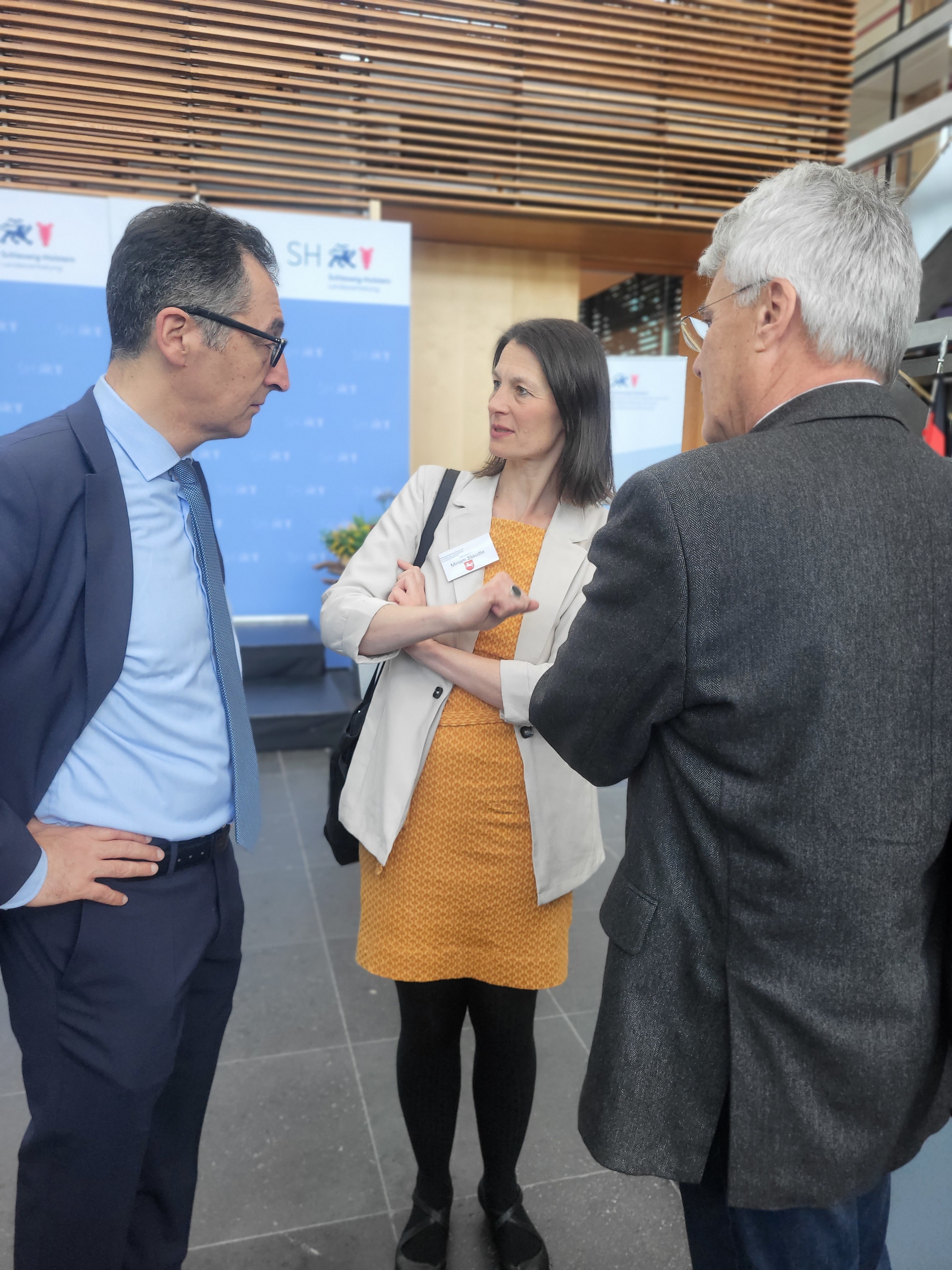 Niedersachsens Agrarministerin Miriam Staudte (Mitte) und Staatssekretär Michael Marahrens (rechts) im Gespräch mit Bundeslandwirtschaftsminister Cem Özdemir.