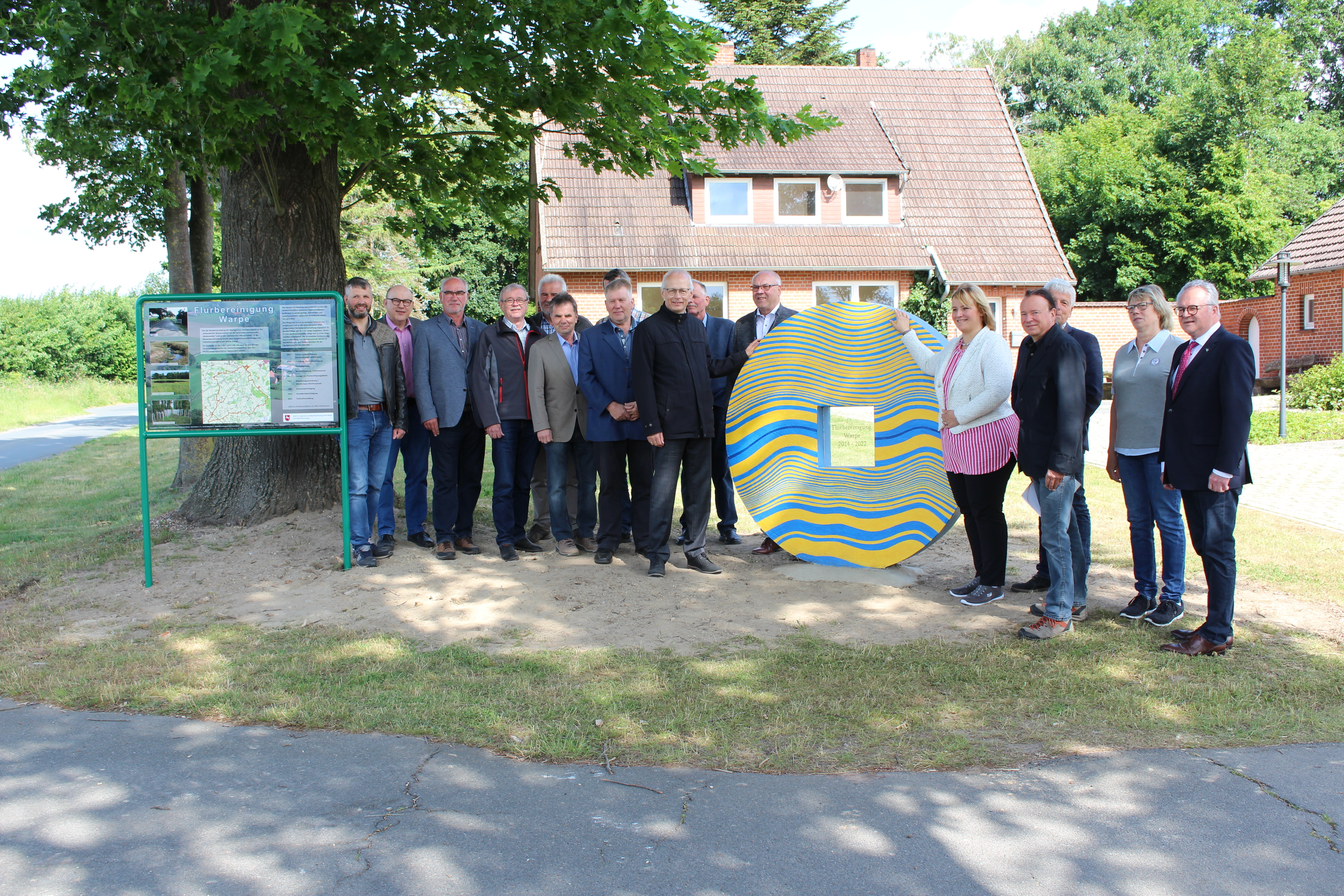 Sulingen. Anlässlich der Beendigung des Flurbereinigungsverfahrens in Warpe (Landkreis Nienburg) fand heute (13.6.) eine Abschlussveranstaltung im Landhaus Hünecke statt. Den symbolischen „Schlussstein“ hatte zuvor Künstler Pablo Hirndorf im Skulpturenpark Warpe enthüllt. Die Skulptur soll durch ihre runde Form an einen Mühlstein erinnern, was wiederum zur Region mit ihren Bachläufen und Mühlen passt.