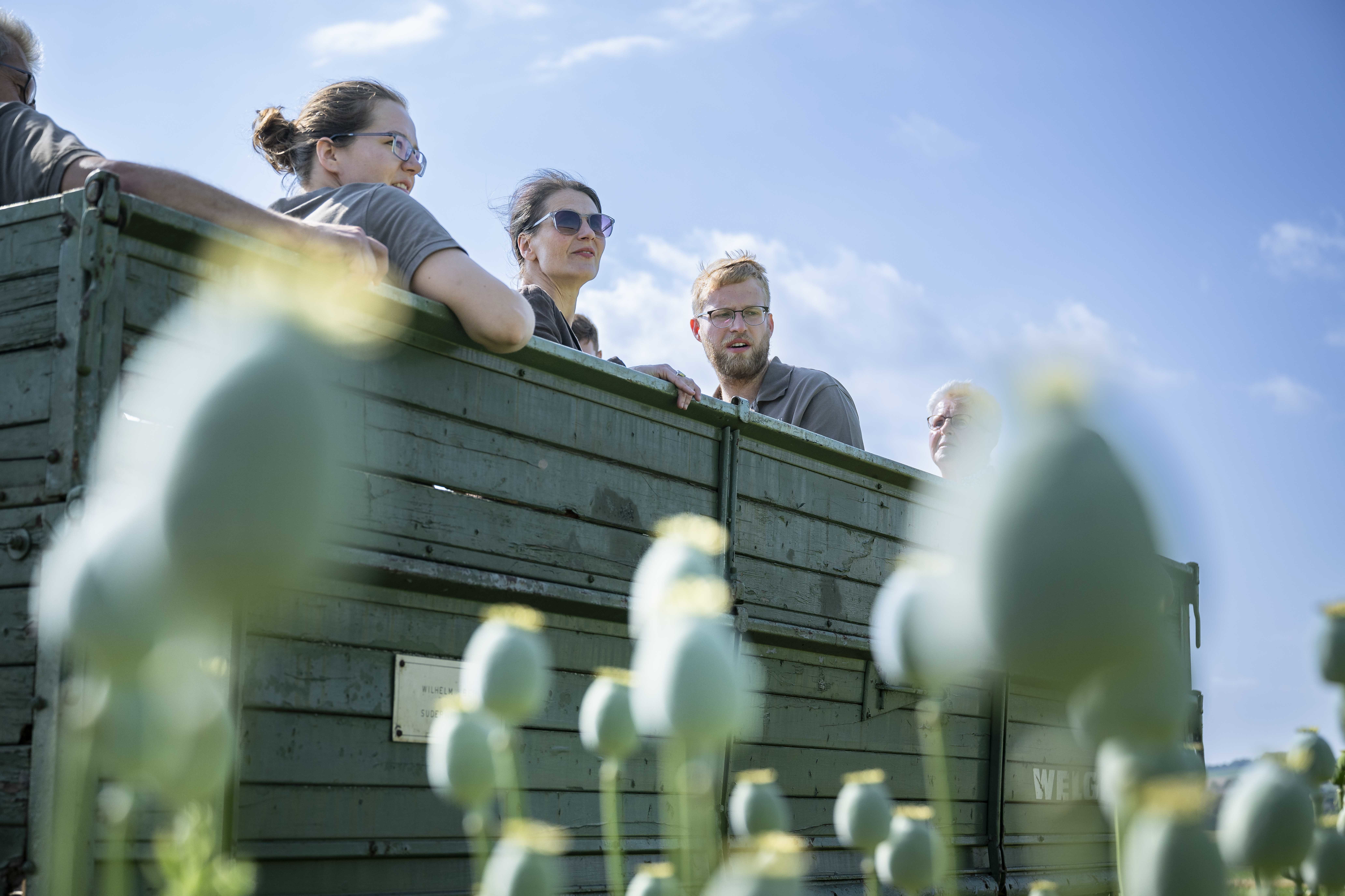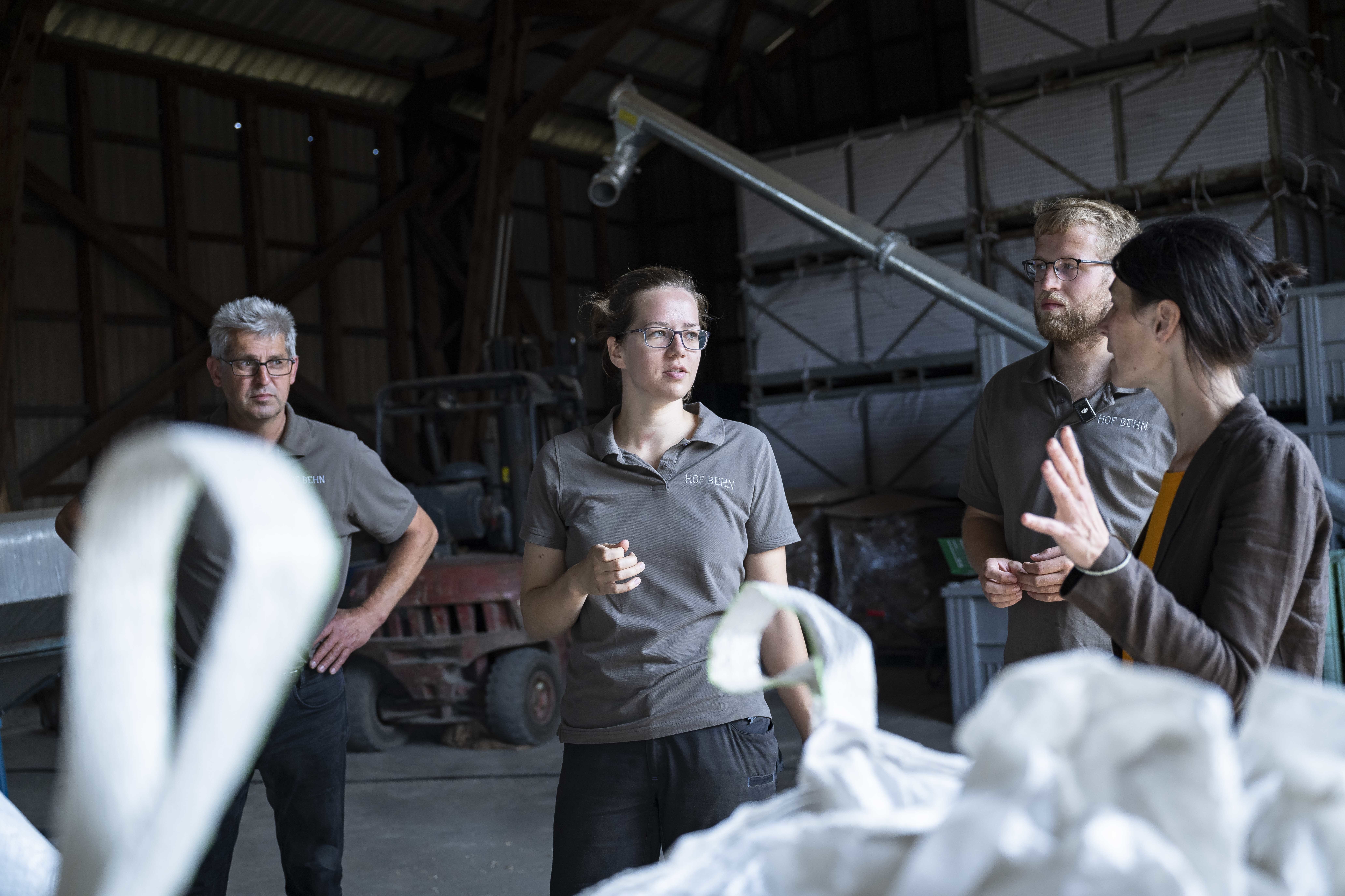 Als erste Station stand die Ortschaft Rümmer im Landkreis Helmstedt auf dem Programm. Das Team vom Hof Behn bewirtschaftet den Familienbetrieb mit ca. 600 Hektar Fläche bereits in der vierten Generation. Dabei stehen nachhaltige Anbaumethoden, Vor-Ort-Verarbeitung und regionale Vermarktung im Mittelpunkt. Beim Anbau vielfältiger Fruchtfolgen, stetigem Zwischenfruchtanbau mit Mohn, Sonnenblumen, Belugalinsen, Leindotter, Roggen, Dinkel oder Schwarzkümmel, verzichtet Hof Behn in Teilen komplett auf Pflanzenschutzmittel. Aufgrund einer stimmigen Kombination von biologischen und konventionellen Verfahren leistet der Betrieb einen wichtigen Beitrag für das Ökosystem und die Artenvielfalt.
