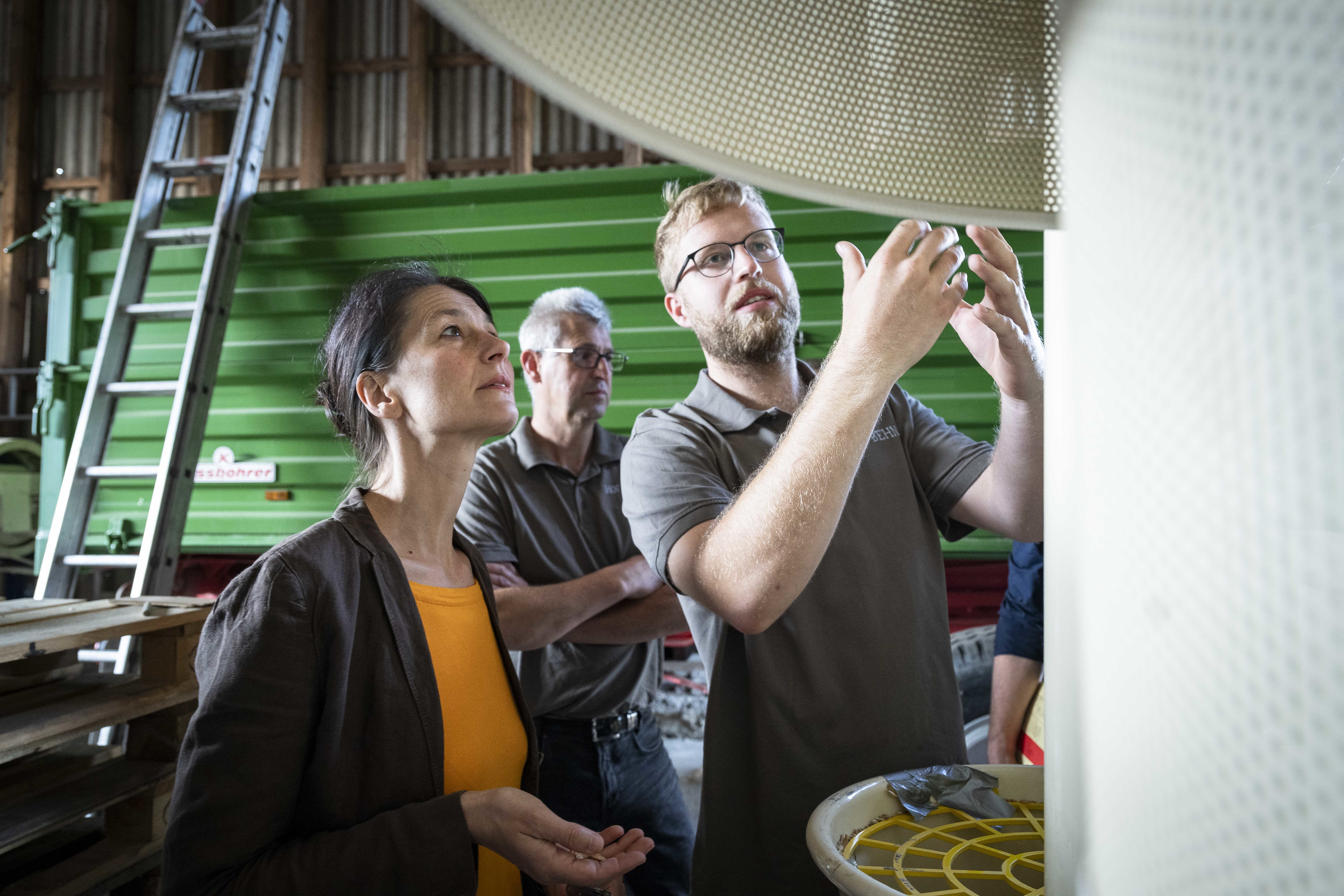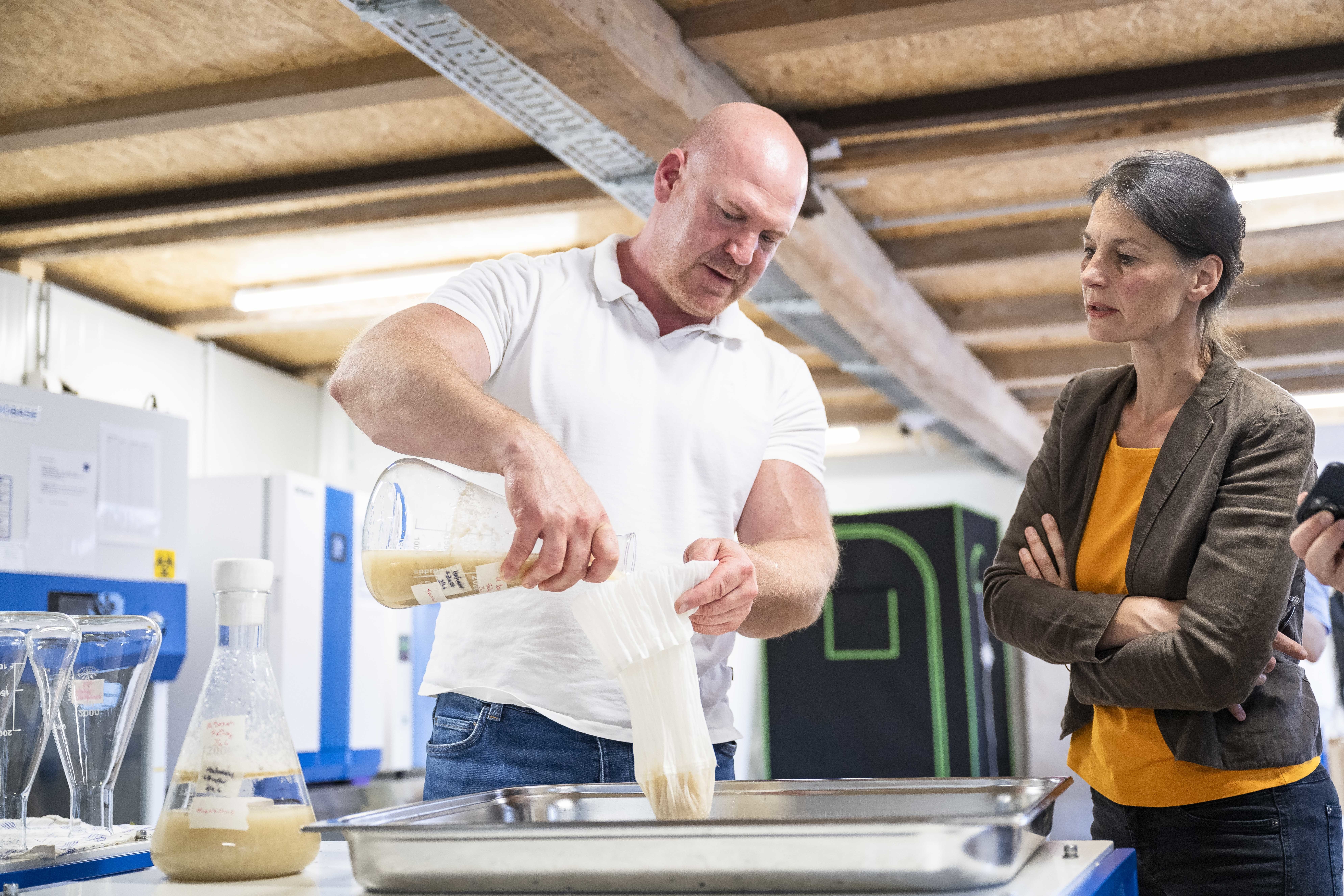 Weiter ging es für Miriam Staudte nach Jelmstorf im Landkreis Uelzen zu Kynda Biotech. Das Start Up rund um Geschäftsführer Daniel MacGowan von Holstein und Franziskus Schnabel produziert protein- und nährstoffreiches Pilzmyzel. Das fermentierte Produkt kann als eiweißreicher Fleischersatz verwendet werden. Das Nahrungsmittel entsteht in einem innovativen und gleichzeitig einfachen Prozess: Wasser, Reststoffe wie beispielsweise Kleie, eine Pilz-Starterkultur, sowie geringe Mengen an Nährstoffen werden in einem Fermenter vermischt und auf etwa 30 Grad erwärmt. Nach 48 Stunden kann das Myzel geerntet werden. Für die Weiterverarbeitung muss lediglich das Wasser abgepresst werden. Bei dem verwendeten Pilz handelt sich nicht um ein so genanntes Novel Food. Eine EU-Zulassung durch die EFSA ist somit nicht notwendig.