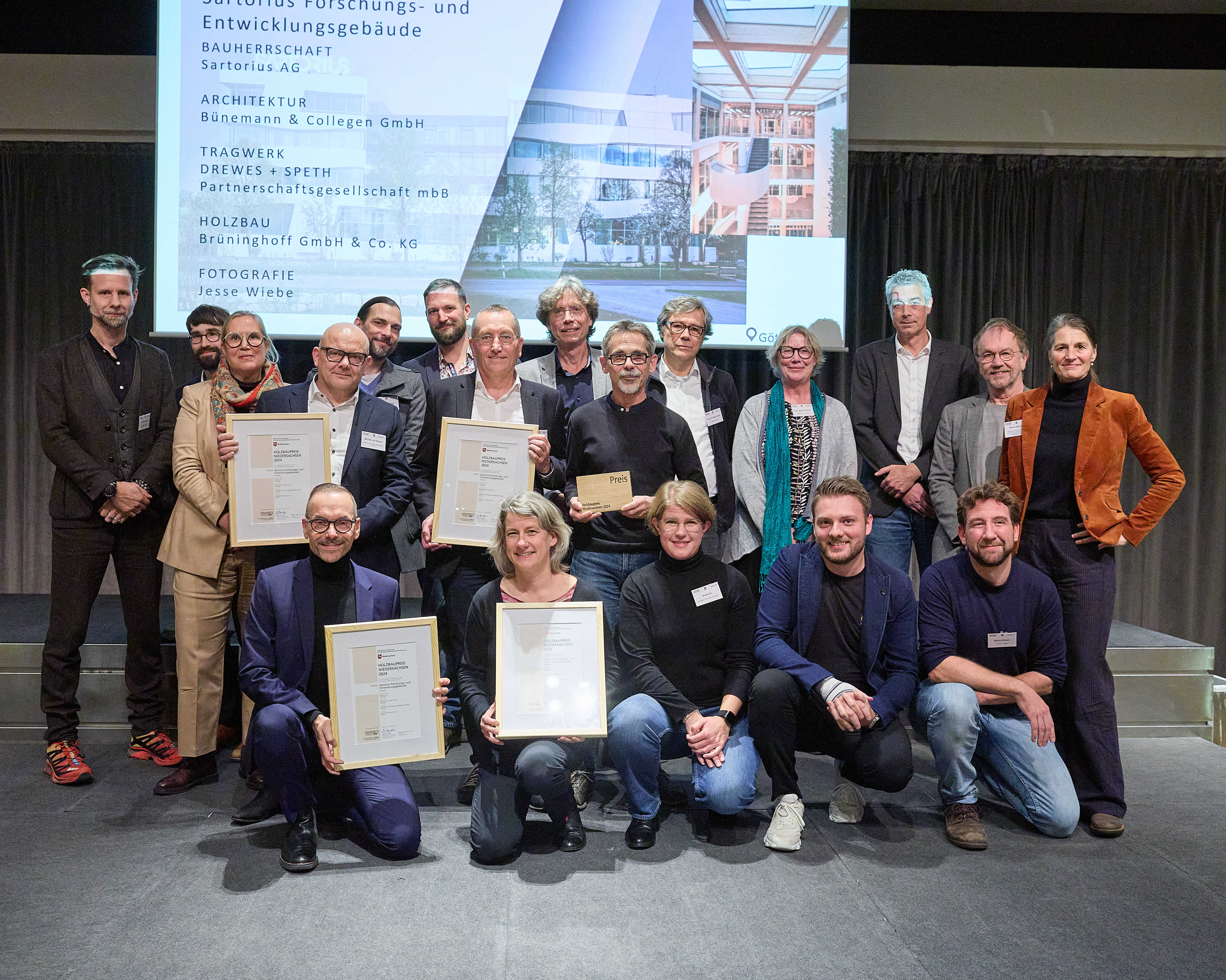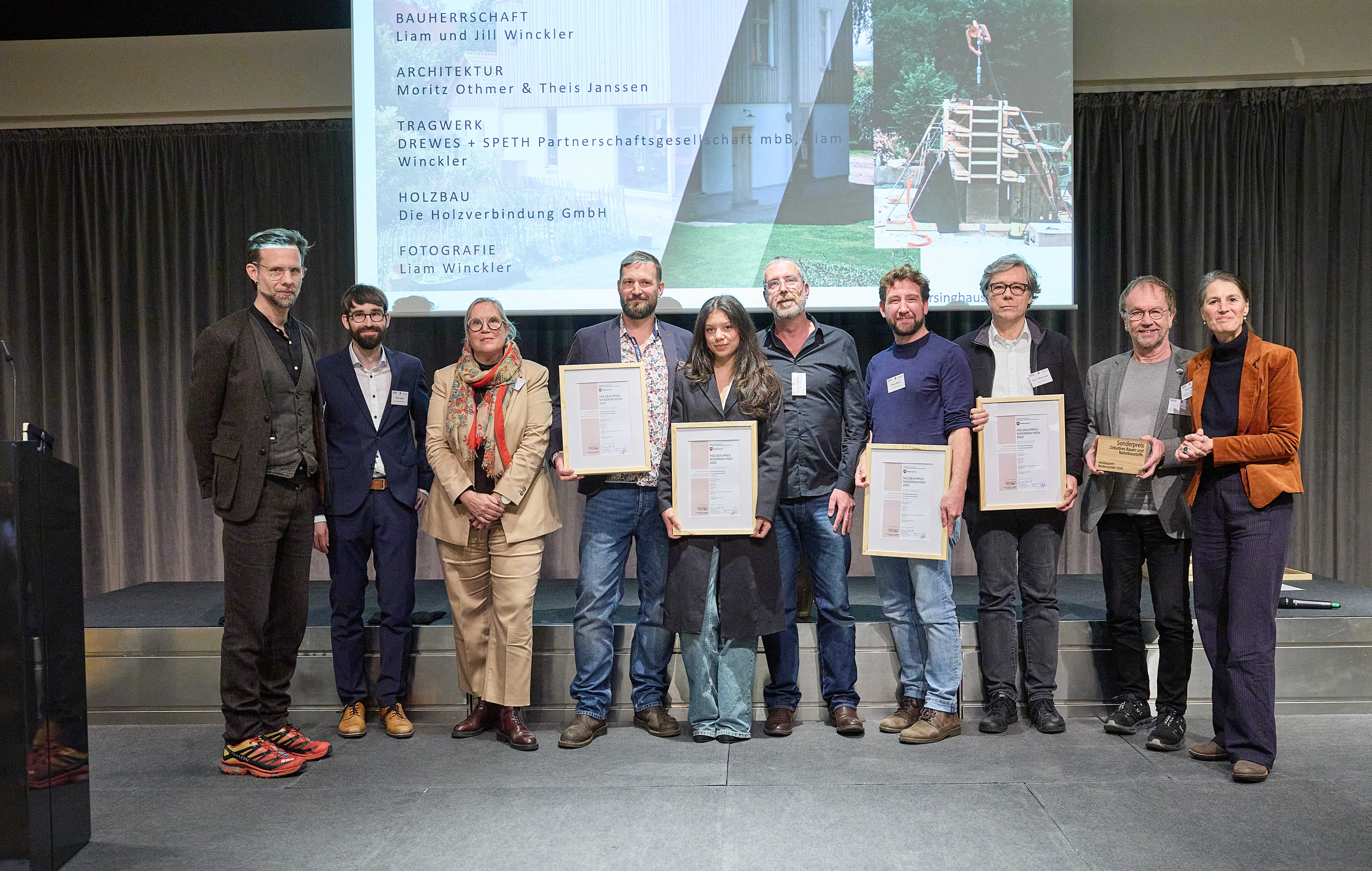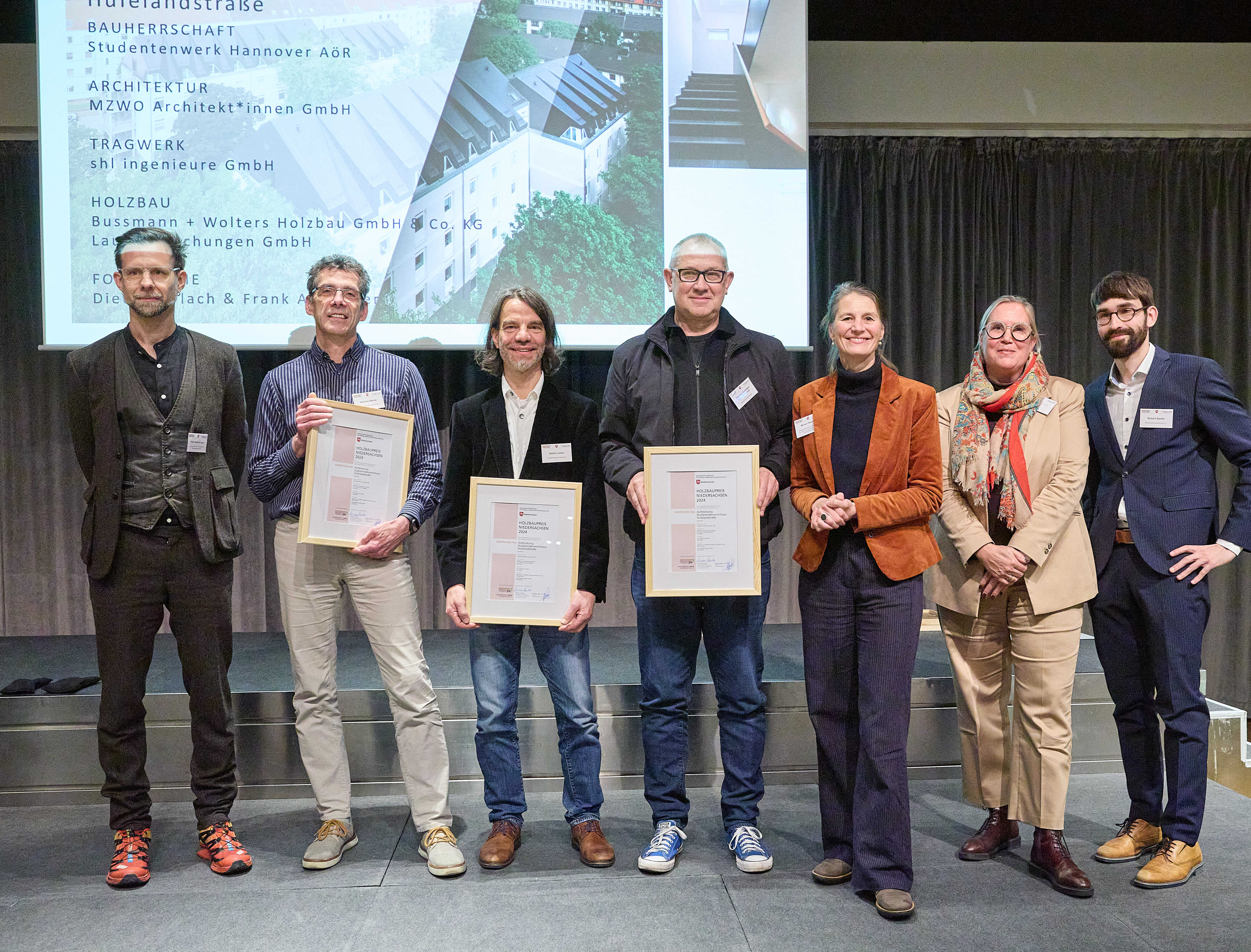 Aus insgesamt 26 Bewerbungen kamen acht Holzbauten in die engere Wahl. Neben den oben genannten Preisträgern wurden noch zwei Anerkennungen überreicht, und zwar an das Coppenrath Innovation Centre in Osnabrück und für die Aufstockung des Studentenwohnheims Hufelandstraße in Hannover.