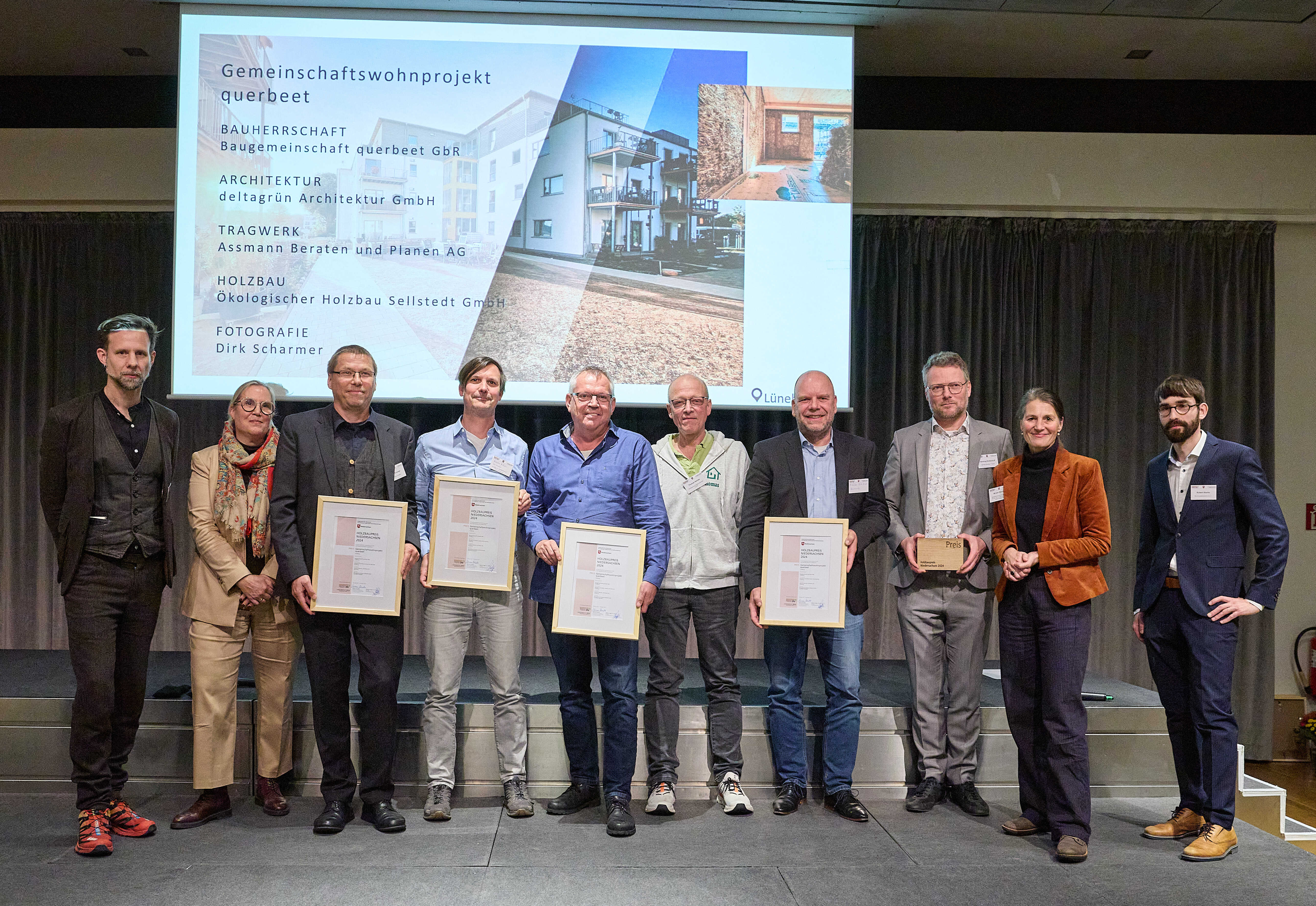 Hannover. Die Gewinner des „Holzbaupreises Niedersachsen 2024“ stehen fest! In diesem Jahr geht der Holzbaupreis gleichrangig an das Gemeinschaftswohnprojekt querbeet in Lüneburg, das Haus M in Isenbüttel und das Sartorius Forschungs- und Entwicklungsgebäude in Göttingen. Der Sonderpreis Zirkuläres Bauen und Naturbaustoffe ging an das Einfamilienhaus in Gemeinschaft in Barsinghausen. Die Schirmherrin des Wettbewerbs, Forstministerin Miriam Staudte, überreichte gestern (11. November) gemeinsam mit dem Juryvorsitzenden Professor Markus Langer die Preise und Anerkennungen an die Finalisten des Wettbewerbs, der vom Landesbeirat Holz e.V., dem Landesmarketingfonds Holz des 3N Kompetenzzentrums Niedersachsen Netzwerk Nachwachsende Rohstoffe und Bioökonomie e.V. zum fünften Mal vergeben wurde.