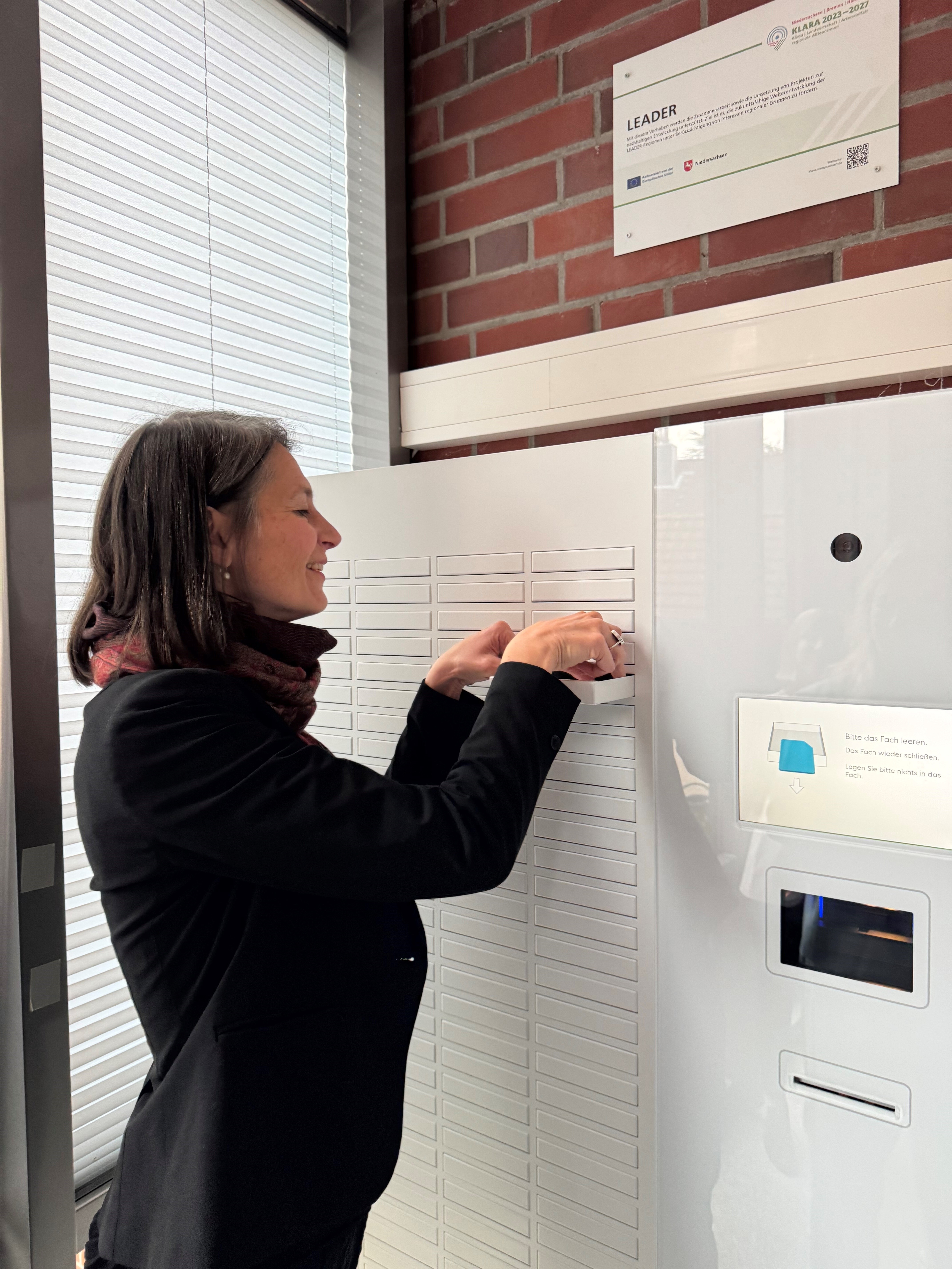 Ministerin Staudte: „Was bekannte Paketdienstleister können, kann die Verwaltung allemal. Die Samtgemeinde Harsefeld hat eine Dokumentenausgabebox aufgestellt, damit ihre Bürgerinnen und Bürger bestimmte amtliche Dokumente rund um die Uhr abholen können. Diese praktische Lösung hat das Landwirtschaftsministerium gerne gefördert.“