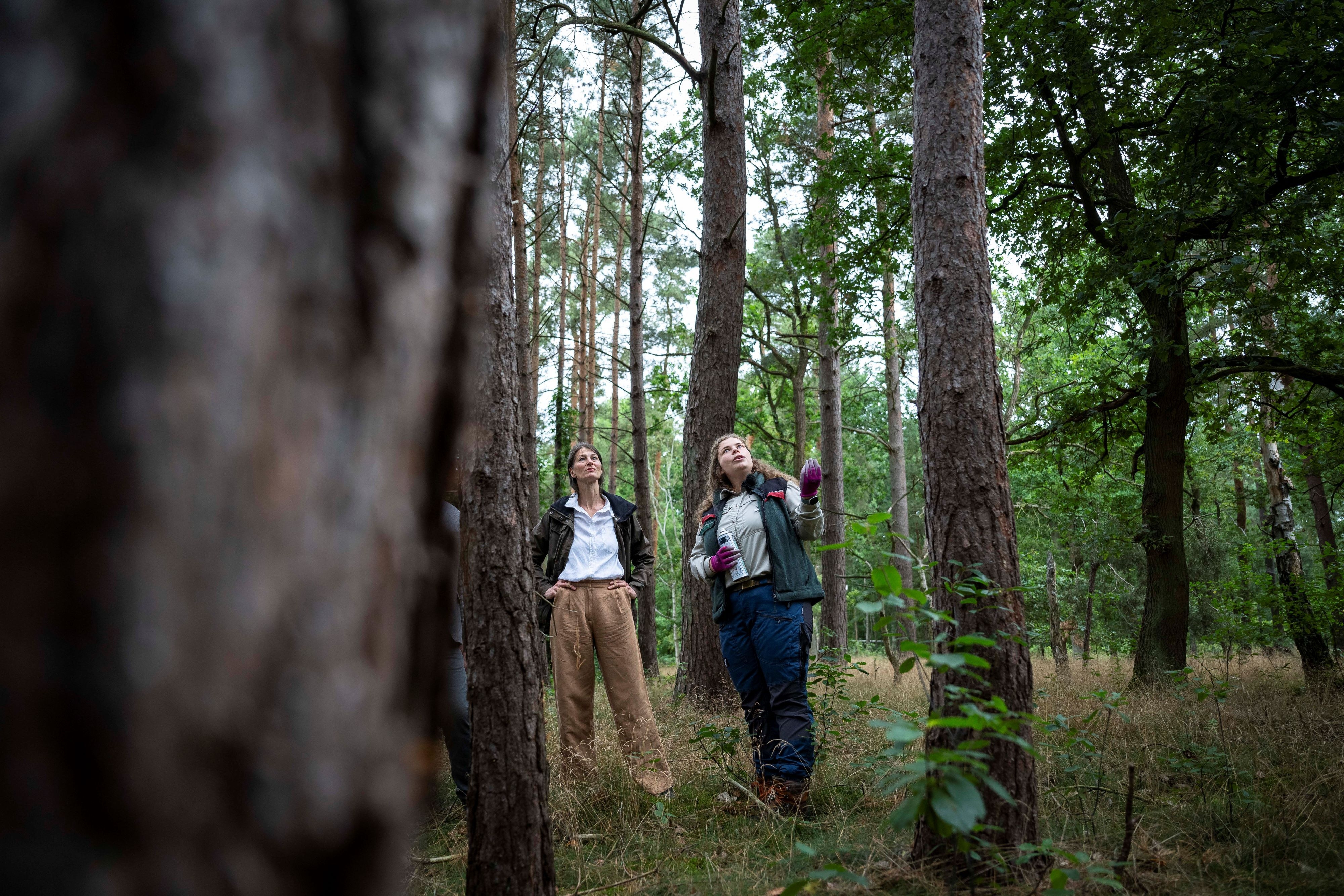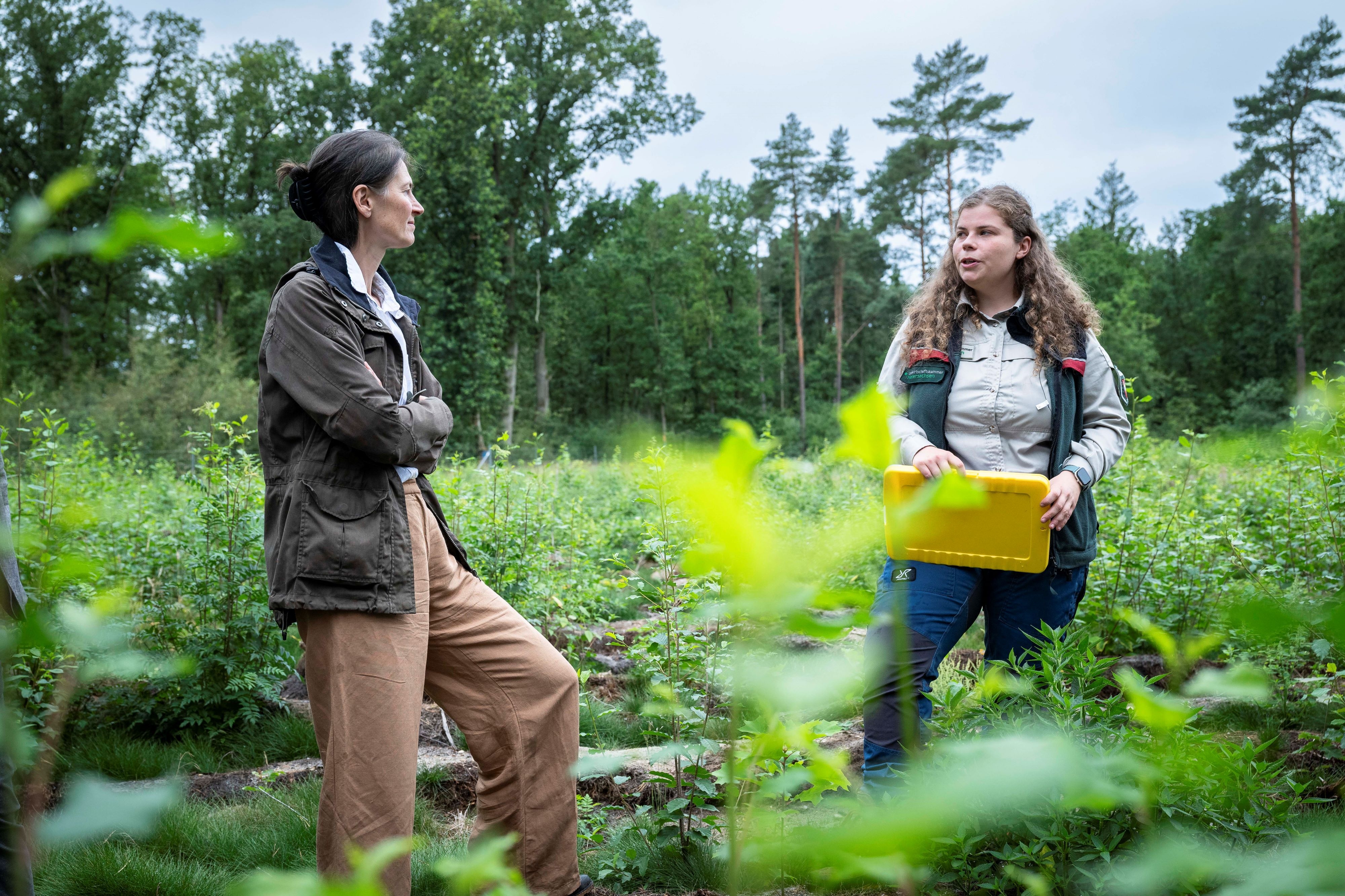 Der erste Stopp der Sommerreise führte Forstministerin Miriam Staudte jetzt zur Bezirksförsterei Suhlendorf (Landkreis Uelzen), die etwa 2.500 Hektar Wald von rund 200 Waldbesitzenden umfasst. Leiterin ist seit April 2025 Cindy Paustian. Keine leichte Aufgabe, denn: Durch die höheren Niederschläge im vergangenen Jahr geht es dem Wald zwar etwas besser als in den von Dürre geprägten Vorjahren – das Schadniveau ist jedoch weiterhin hoch. Gemeinsam mit den Waldbesitzenden möchte die 28-Jährige daher die Anpassung der Wälder an die klimatischen Herausforderungen aktiv vorantreiben. Wie das aussehen kann, zeigte sie Ministerin Staudte in einem Wald in Emern. Auf einer Fläche von 0,7 Hektar wurden Roteichen und Buchen gepflanzt. Doch der Waldumbau braucht Zeit: Noch sind die Pflanzungen erst 40 bis 50 Zentimeter hoch – bis der Endbestand nach stetiger Durchforstung seine Höhe von 20 bis 25 Metern erreicht, werden zwischen 100 und 140 Jahre vergehen. Forstministerin Miriam Staudte: „Den Wald zu klimastabilen Mischwäldern umzubauen und weiterzuentwickeln – das ist eine große Aufgabe. Wir brauchen engagierte Nachwuchskräfte wie Cindy Paustian, die gestalten möchten und langfristig Verantwortung übernehmen. Sie leisten einen wichtigen Beitrag für die Zukunft der Wälder in Niedersachsen.“
