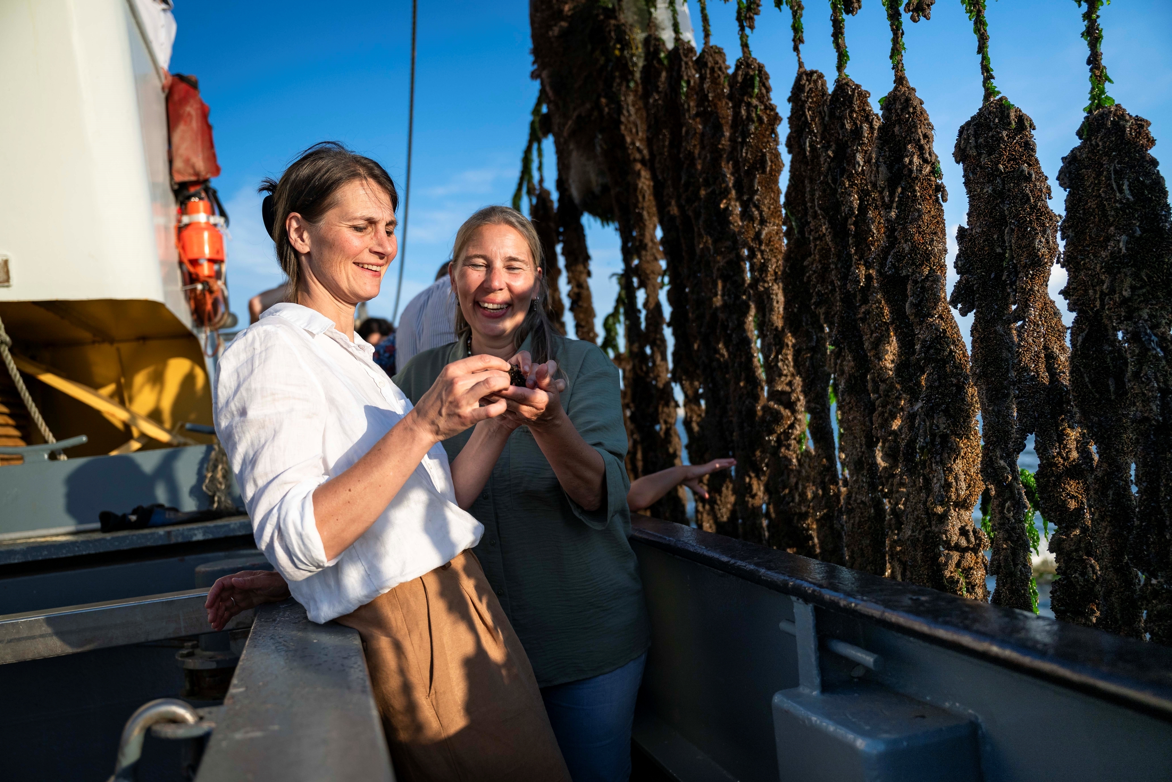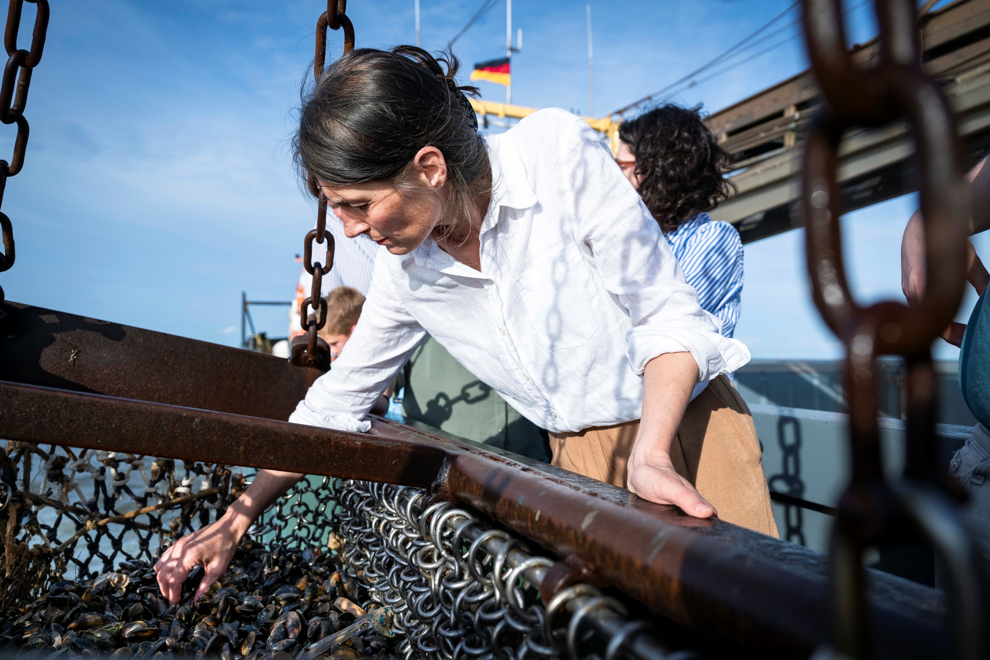 Anschließend ging es an die Küste nach Hooksiel (Landkreis Friesland) – und direkt auf einen Kutter. Manuela Melle ist Geschäftsführerin der Niedersächsischen Muschelfischer GbR und vertritt in dieser Funktion die drei Muschelfischerbetriebe an der Küste. Ihre Aufgabe: den Dialog mit Behörden und Verbänden führen, um die Interessen der Muschelfischer zu fördern. Doch wie funktioniert die Muschelfischerei in Niedersachsen eigentlich? Die Muschelfischereibetriebe „säen“ die gefangenen oder mit Hilfe von künstlichem Substrat angesiedelten Besatzmuscheln zunächst einmal aus. Nach etwa zwei Jahren werden sie wieder abgeerntet, und zwar ab einer Größe von etwa fünf Zentimetern. Wie sich die kleinen Muscheln am Substrat ansiedeln und die großen Muscheln schließlich geerntet werden, zeigte Manuela Melle auf der Kutterfahrt vor Hooksiel. Aber auch andere Inhalte waren Thema – unter anderem beschäftigen Manuela Melle die Auswirkungen der LNG-Terminals vor Ort, die Trassenanbindungen zu den Offshore-Windparks und die hohen Energiekosten für Treibstoffe. Fischereiministerin Miriam Staudte: „Die Ernte von Miesmuscheln auf einem Kutter zu verfolgen – das war ein spannender Einblick in die Arbeit der Muschelfischer. Die Branche steht derzeit vor großen Herausforderungen. Die niedersächsische Küstenfischerei wirtschaftlich und ökologisch tragfähig weiterzuentwickeln – genau darum geht es uns im Fischereidialog, den mein Haus im Frühjahr mit dem Umweltministerium gestartet hat, und an dem die Muschelfischer beteiligt sind. Unser gemeinsames Ziel muss es sein, die niedersächsische Küstenfischerei zukunftsfähig und nachhaltig auszurichten.“