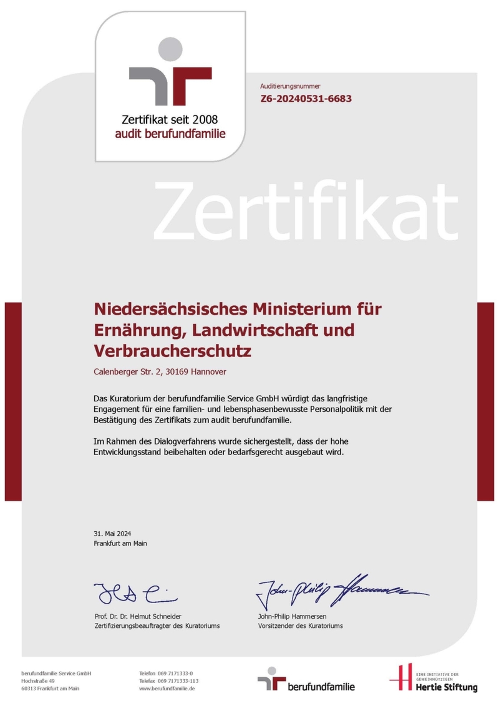 Bereits zum sechsten Mal wurde das Niedersächsische Ministerium für Ernährung, Landwirtschaft und Verbraucherschutz (ML) von der berufundfamilie Service GmbH für seine familien- und lebensphasenbewusste Personalpolitik mit dem audit berufundfamilie ausgezeichnet. Damit hat das ML erneut unter Beweis gestellt, dass es sich in besonderer Weise um die Vereinbarkeit von Beruf und Privatleben kümmert, beispielsweise mit flexiblen Arbeitszeitregelungen und -modellen, aber auch mit ganz einfachen Maßnahmen wie einem dauerhaft eingerichteten Familienparkplatz.