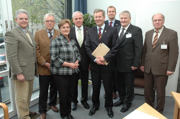 Auf dem Foto sind zu sehen v.l.n.r.: Friedrich-Otto Ripke (StS ML), Fritz Stegen (Präsident Lwk Niedersachsen), Brigitte Scherb (Präsidentin Deutscher LandFrauenverband), Werner Hilse (Präsident Landvolk Niedersachsen), Ministerpräsident Christian Wulff, Jörn Johann Dwehus (Hauptgeschäftsführer Landvolk Niedersachsen), Minister Hans-Heinrich Ehlen (ML), Friedrich Scholten (Präsident Lwk Niedersachsen) |