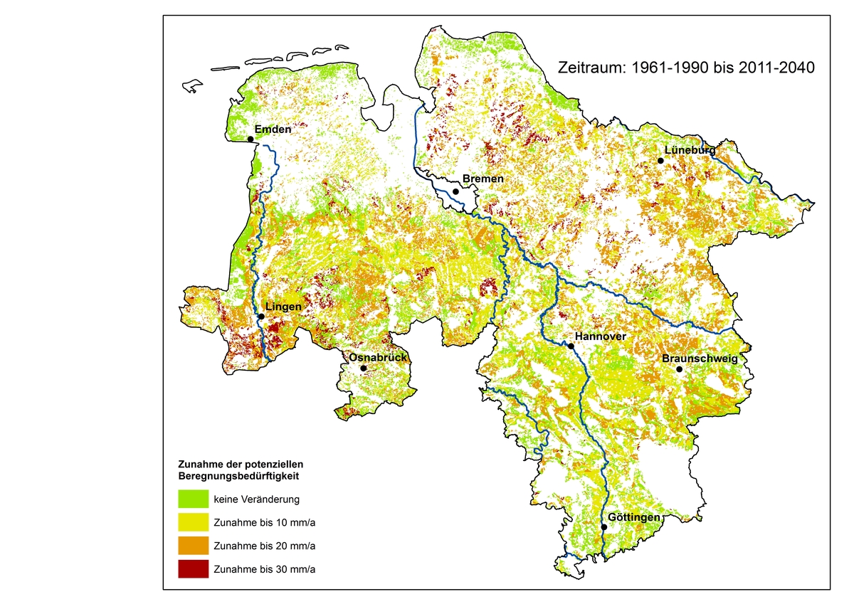 In den Karten ist am Beispiel der potentiellen Beregnungsbedürftigkeit der Einfluss des Klimawandels auf die niedersächsische Landwirtschaft dargestellt. Dabei werden die Erhebungen im Zeitraum von 1961-1990 den Prognosen für 2011-2040 gegenübergestellt.