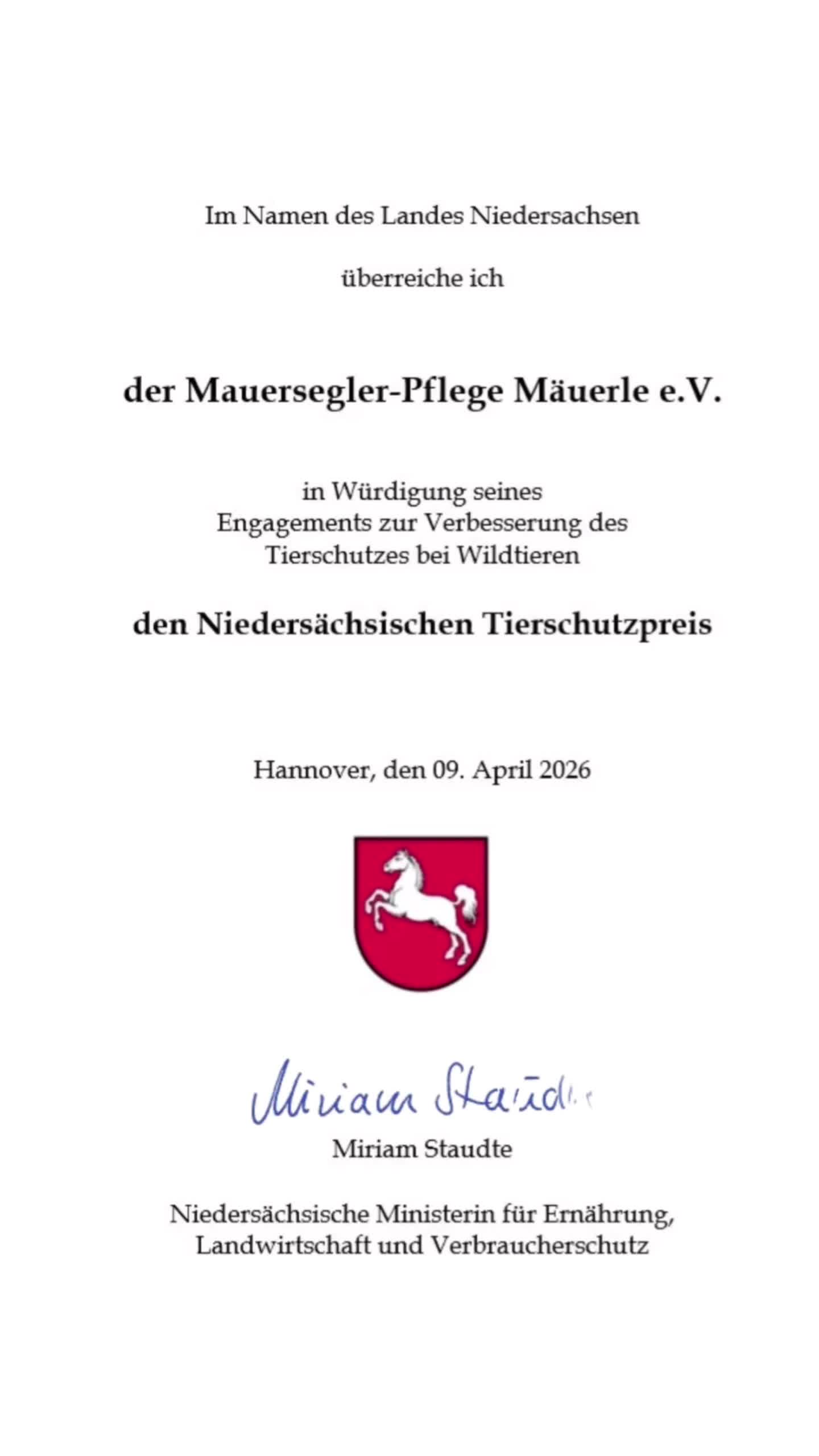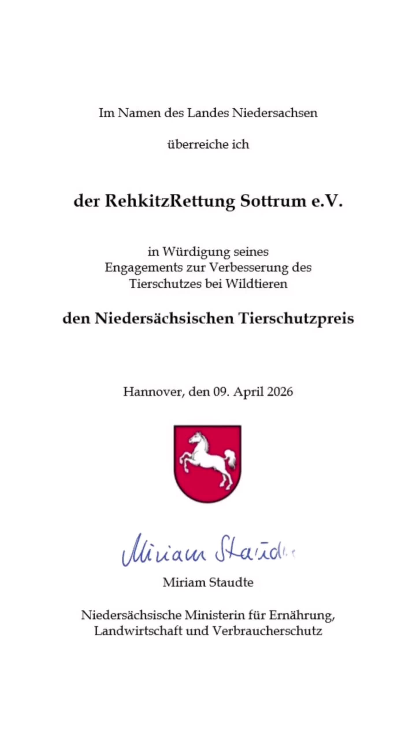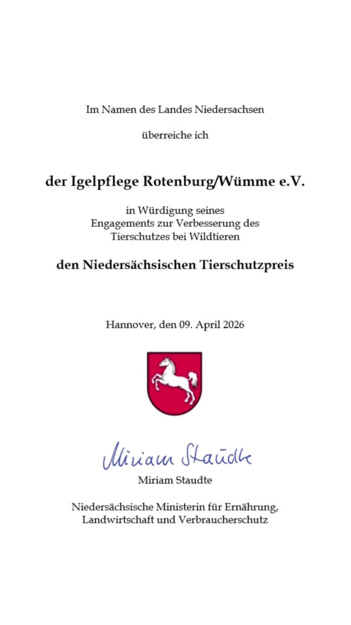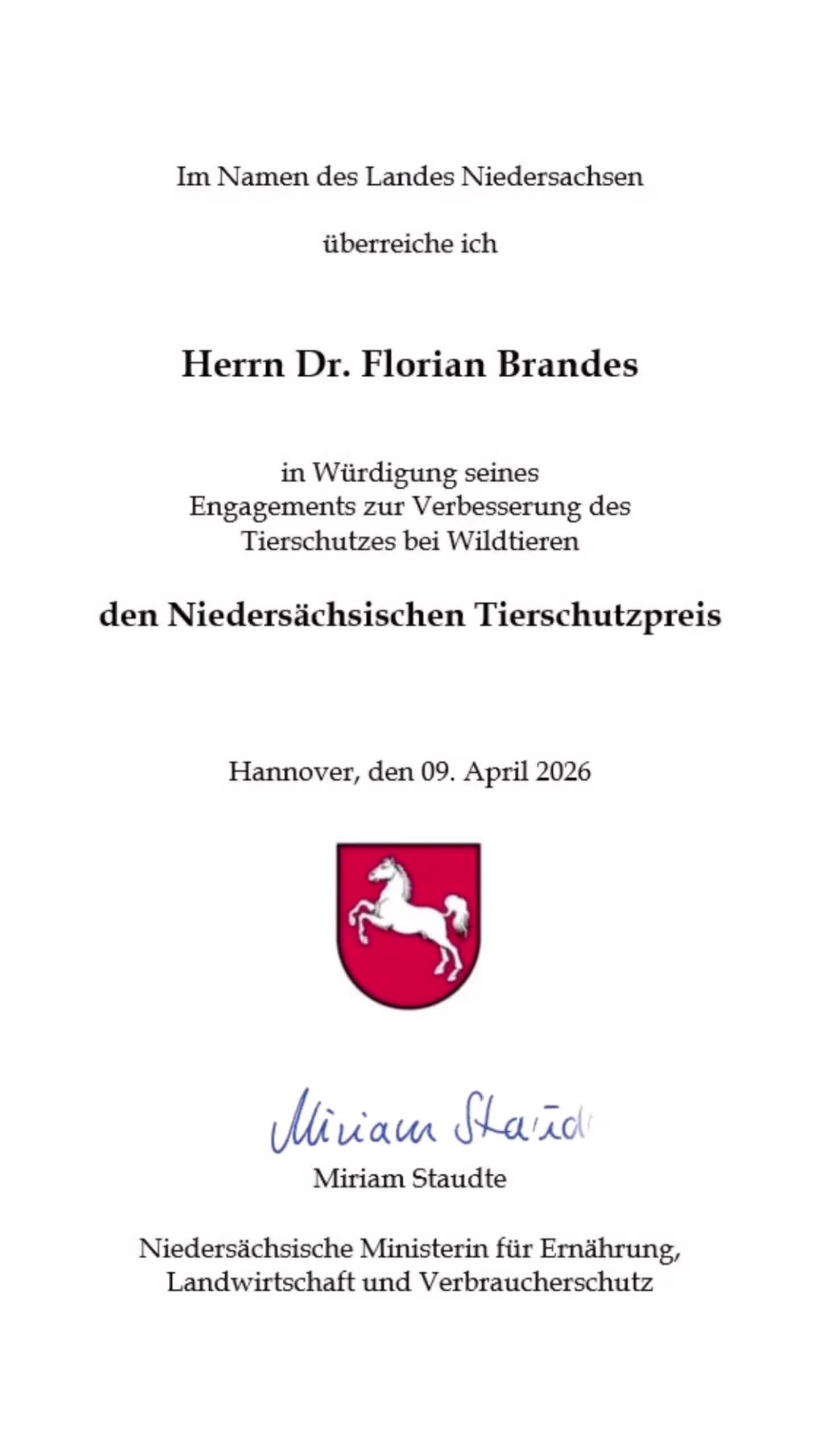 Der Niedersächsische Tierschutzpreis 2026 wurde am 09.04.2026 auf Vorschlag und nach Entscheidung einer Jury vergeben.