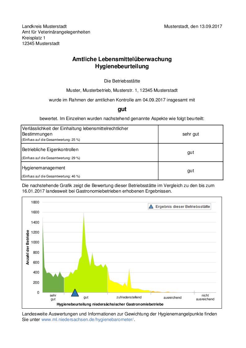 Mit dem Hygienebarometer erhielten Lebensmittelbetriebe eine qualifizierte Rückmeldung über die Ergebnisse der Lebensmittelkontrollen. Lebensmittelbetriebe entschieden selbst, ob sie die Bescheinigung zum Hygienebarometer (Hygienebeurteilung) für Werbezwecke nutzen und in ihrem Betrieb aushängen und damit ihre Ergebnisse den Verbraucherinnen und Verbrauchern transparent machen.