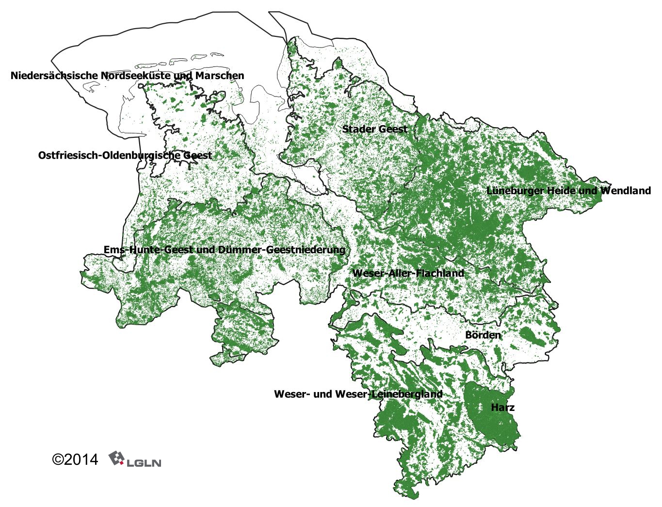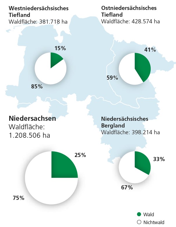 Die Bundeswaldinventur 4 hat für Niedersachsen eine Waldfläche von 1.208.500 ha und eine Bewaldung von 25 % der Landesfläche ermittelt. Unsere heutigen Waldflächen in Niedersachsen sind ein Spiegelbild der gesellschaftlichen Ansprüche. Sie sind das Ergebnis einer mehr als zweihundertjährigen systematischen Forstwirtschaft. Es sind Kulturwälder, die von Menschenhand gepflegt, geschützt und genutzt worden sind. Regional entwickelten sich die Waldanteile sehr unterschiedlich. Die Waldregionen „Westniedersächsisches Tiefland“, „Ostniedersächsisches Tiefland„ und „Niedersächsisches Bergland“ unterscheiden sich deutlich. Der Waldanteil im Westniedersächsischen Tiefland liegt heute bei nur 15 %, während er im Ostniedersächsischen Tiefland auf 41 % deutlich angestiegen ist. Das Niedersächsische Bergland mit seinen Waldgebieten Harz, Solling und Weser-Bergland hat seinen Bewaldungsanteil von 33 % bis heute erhalten.