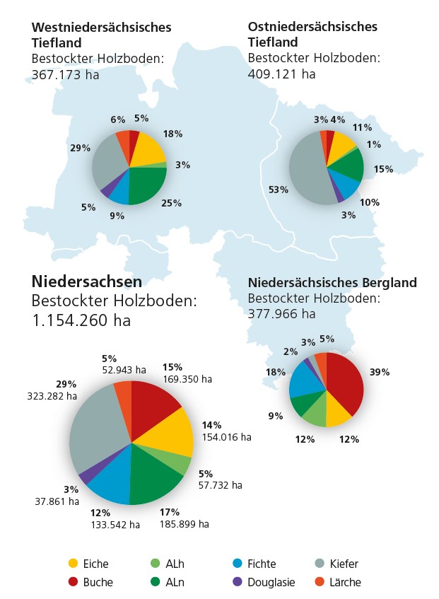 Die in Niedersachsen sehr stark variierenden naturräumlichen und standörtlichen Voraussetzungen, forstgeschichtlichen Entwicklungen und Eigentumsverhältnisse haben zu einer sehr unterschiedlichen Baumartenzusammensetzung in den Regionen geführt.